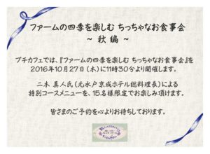 プチカフェでは、「ファームの四季を楽しむ ちっちゃなお食事会~秋編~」を10月27日(木)11時30分より開催します。 二木 真人氏(元水戸京成ホテル総料理長)による特別コースメニューをお届けします。15名様限定でご予約 […]
